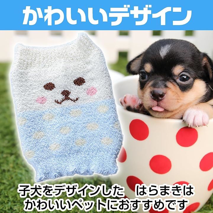 「商品特徴」愛犬のお腹を優しく守る、子犬をデザインした可愛らしい犬用腹巻(はらまき)です。
