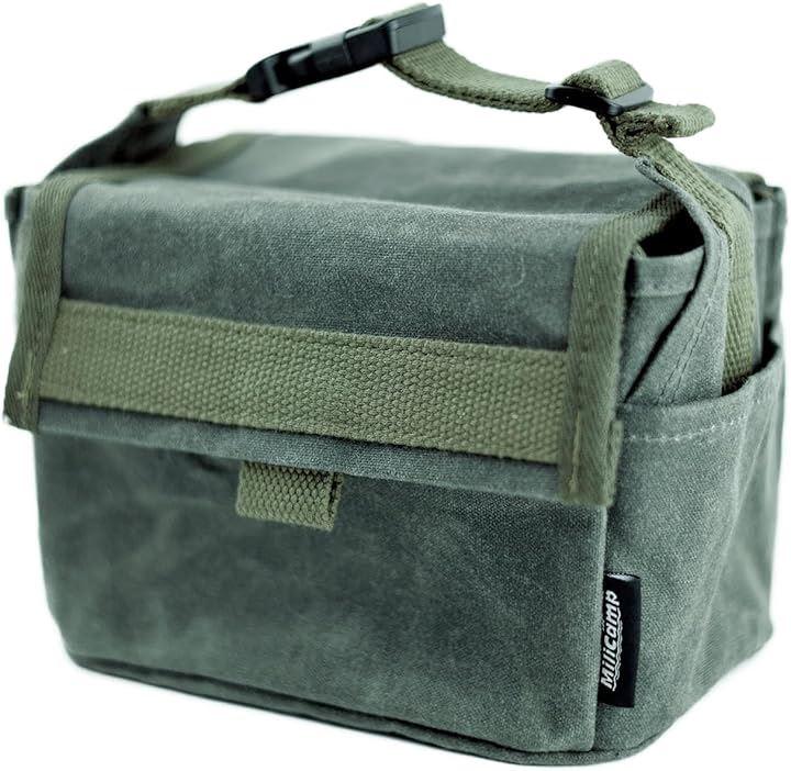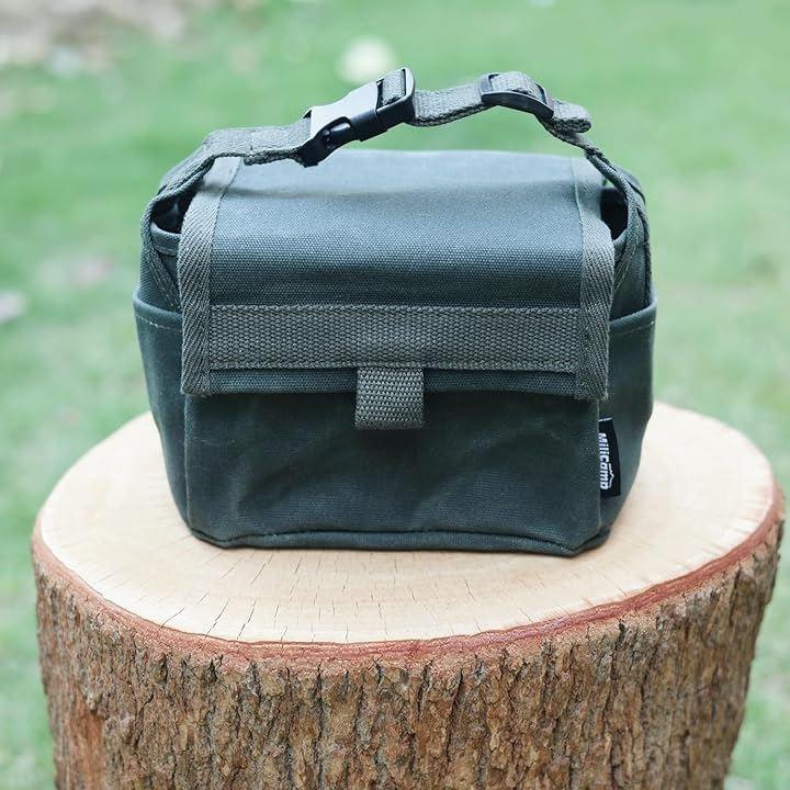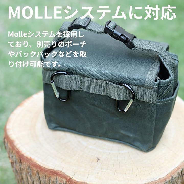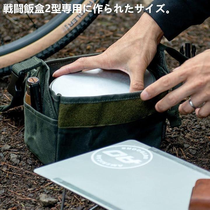 また、幅広面ファスナーと長さ調整が可能なベルトハンドルの組み合わせで、スパイスケースやウォーターボトルなど、戦闘飯盒2型の中にスタッキングできない道具を、戦闘飯盒2型の上部に固定して一緒に持ち運ぶことが可能となっている。