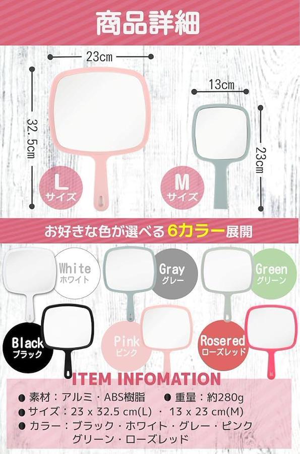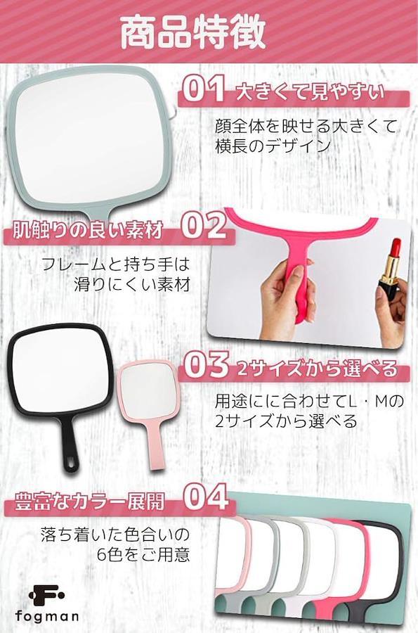 「商品特徴」 大きくて見やすい:顔全体を映せる大きくて横長のデザイン 肌触りの良い素材:フレームと持ち手は滑りにくい素材 2サイズから選べる:用途にに合わせてL・Mの2サイズから選べる 豊富なカラー展開:落ち着いた色合いの6色をご用意