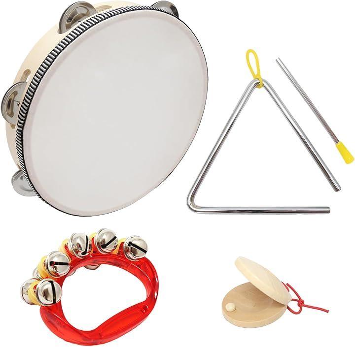 お子様の才能を開花させる。初めてのパーカッション打楽器4点セット。 子供の音楽への第一歩は、まず興味を持つこと。 この打楽器4点セットは、カスタネット、タンバリン、ハンドベル(鈴)、トライアングルといった、幼児から小学生であったり、大人であっても楽しめる定番の楽器を厳選しました。