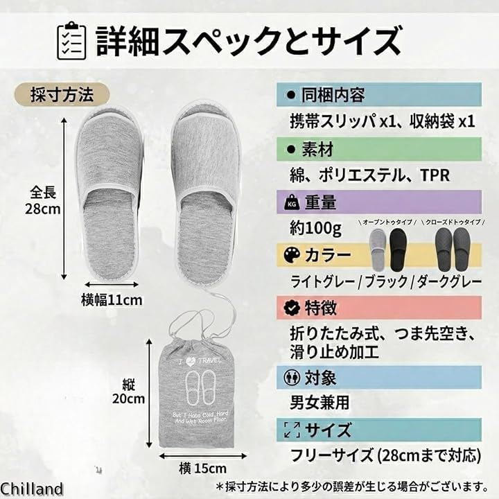 男女兼用で使用可能な折りたたみ式携帯スリッパです。