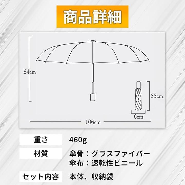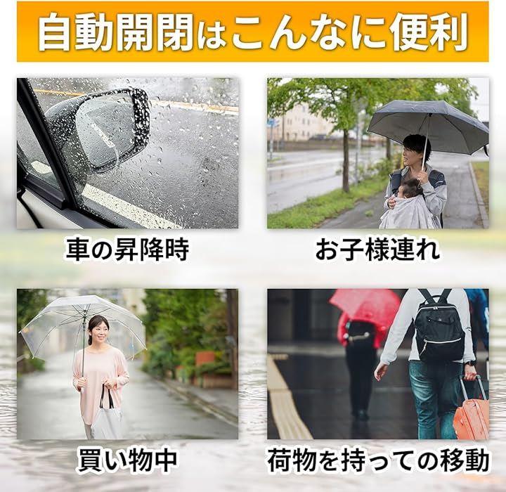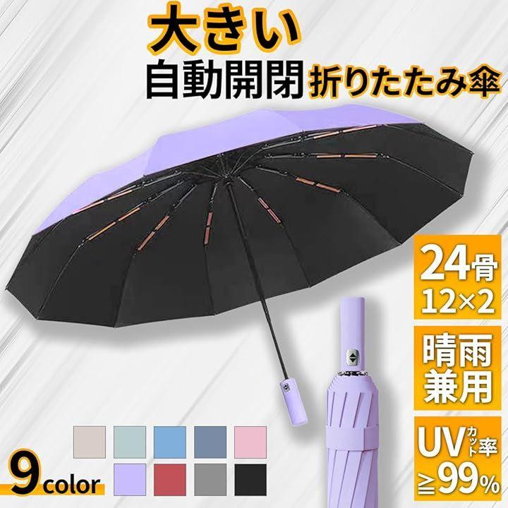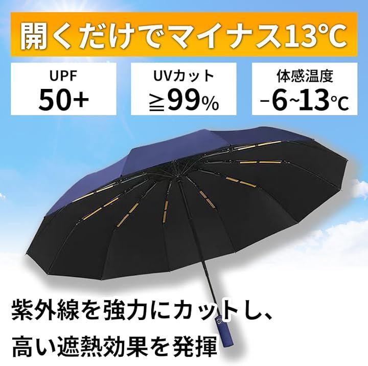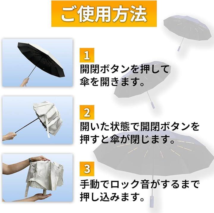 折りたたみ傘 24本骨(12か所x2本) 1. 晴雨兼用 2. 100cmを越えるビッグサイズ 3.開くだけでマイナス13℃ 紫外線を強力にカットし、高い遮熱効果を発揮します UPF:50+ UVカット:99%以上 体感温度:マイナス6~13℃ 4. 耐久性・耐風性に優れた12本骨 5. 自動開閉 ボタンをプッシュするだけで傘が開きます 6.細部へのこだわり 水濡れキャップ、便利なテープ、安全のつゆさき、ひも付きの持ち手を採用しております