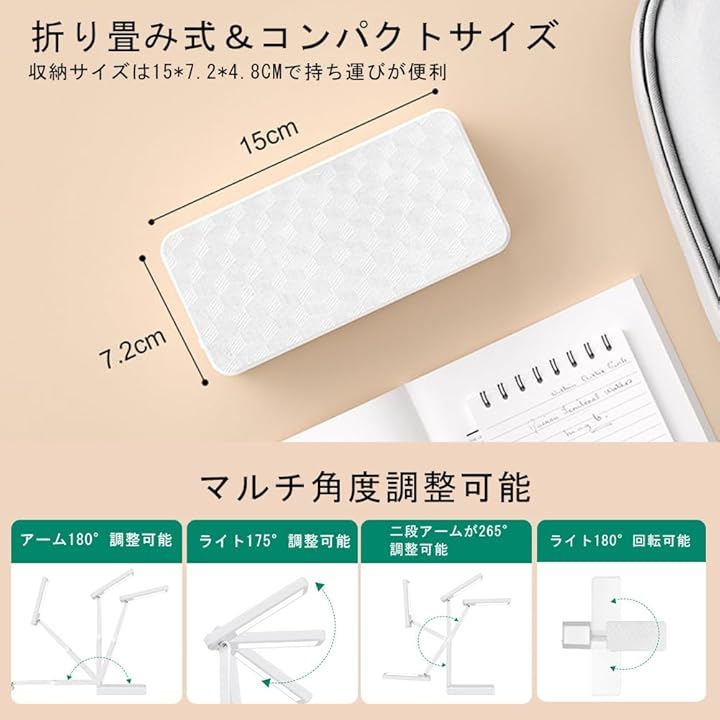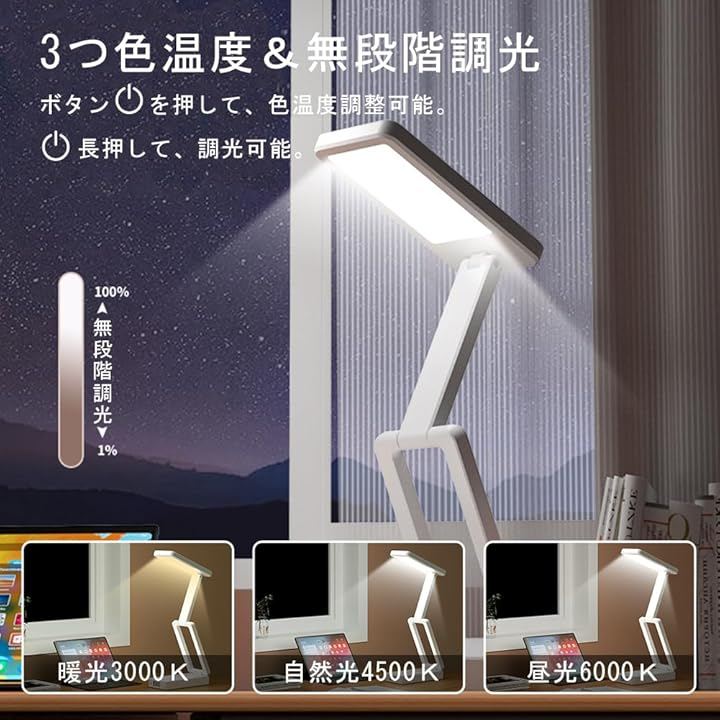 「多機能デスクライト」高性能LEDとコンパクトデザインで、どこでも便利な照明を実現 このledライトは3種類の色温度を無段階調光で調整可能。