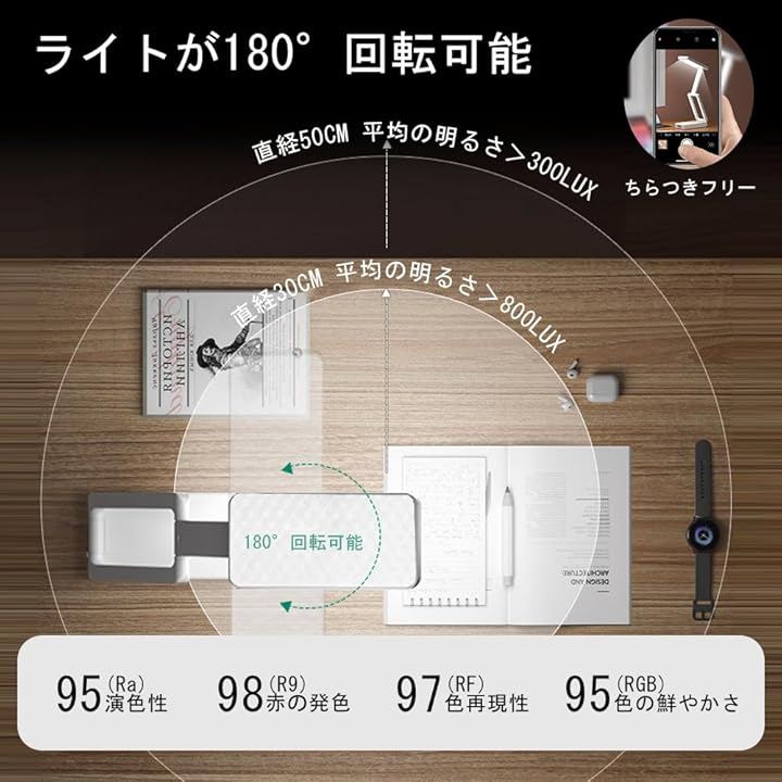 「マルチ角度調整可能」マルチアングル調節で、デスク作業を快適にサポート 主桿は最大180°、ランプヘッドは上下175°、そして左右90°まで自由に調整可能。