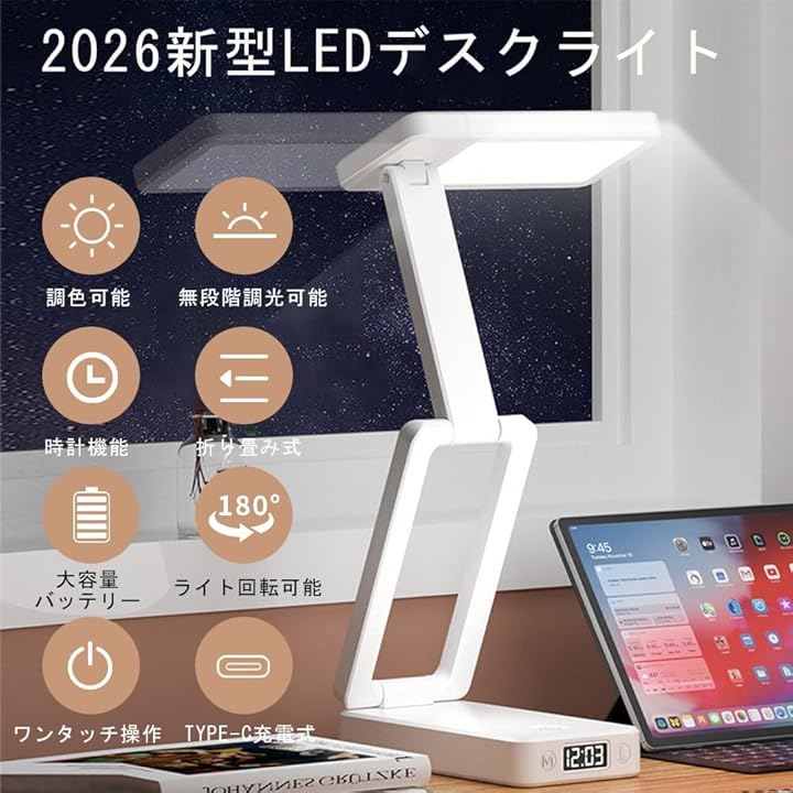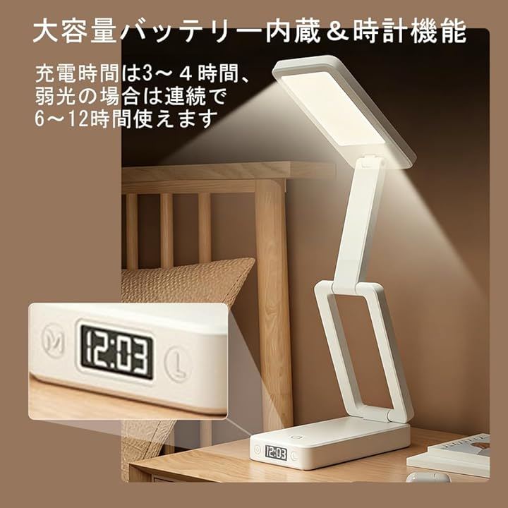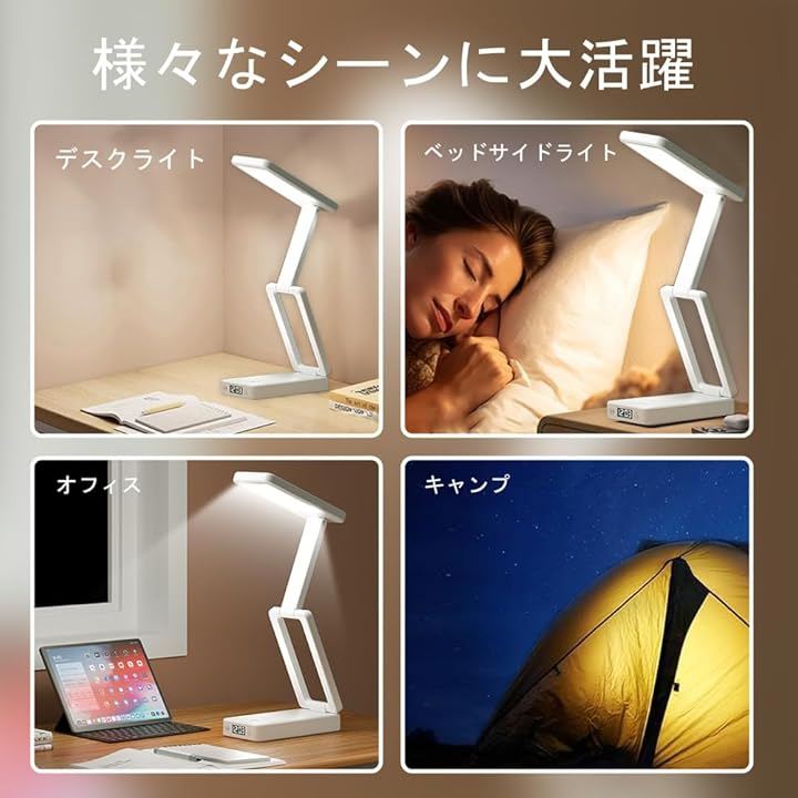 折り畳みデスクライト USB充電式 卓上ライト 角度自由に調整+3つ色温度+無段階調光+時計機能ライト180°回転可能 目に優しい 大容量バッテリー ワンタッチ操作 ledライト 勉強/キャンプ/夜釣りに適用 オフィス用品