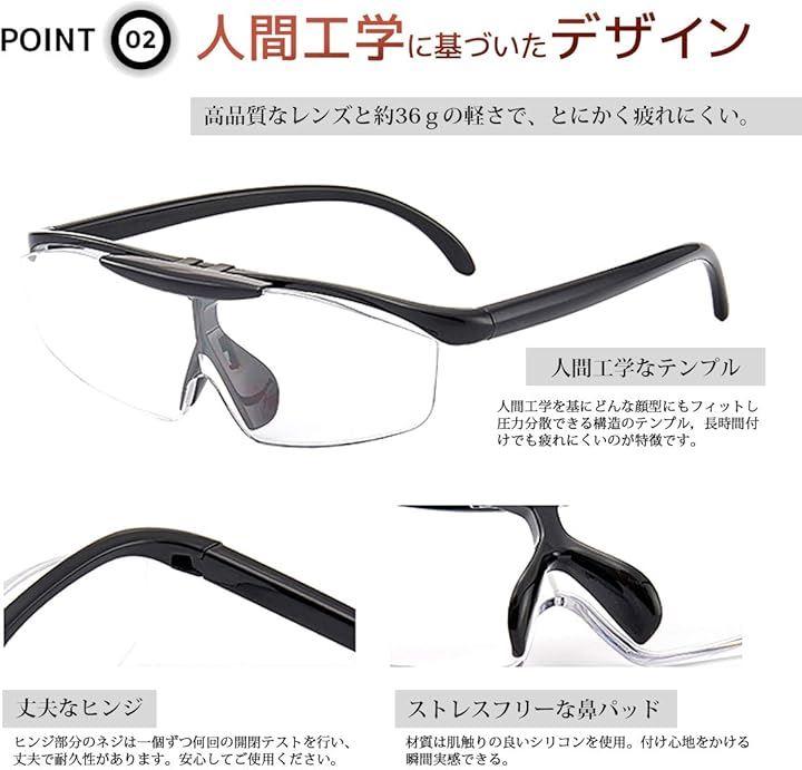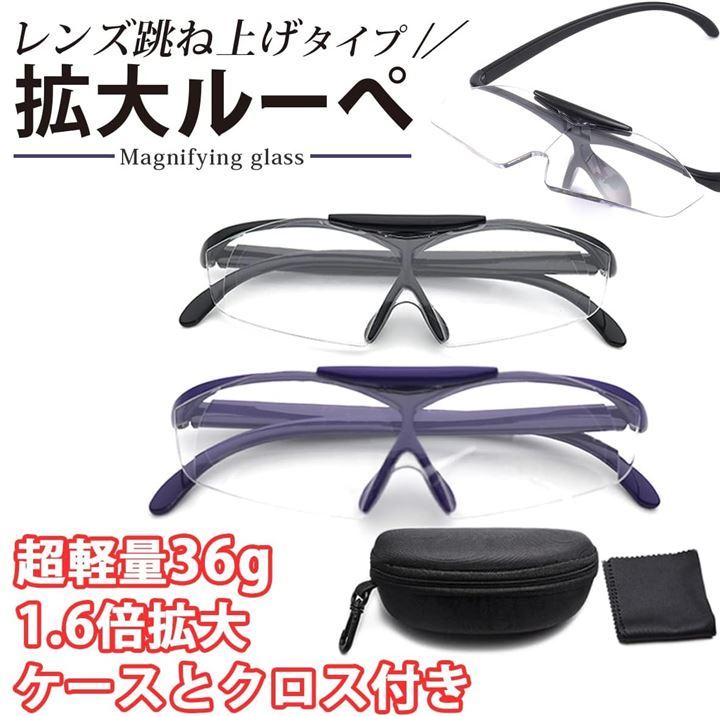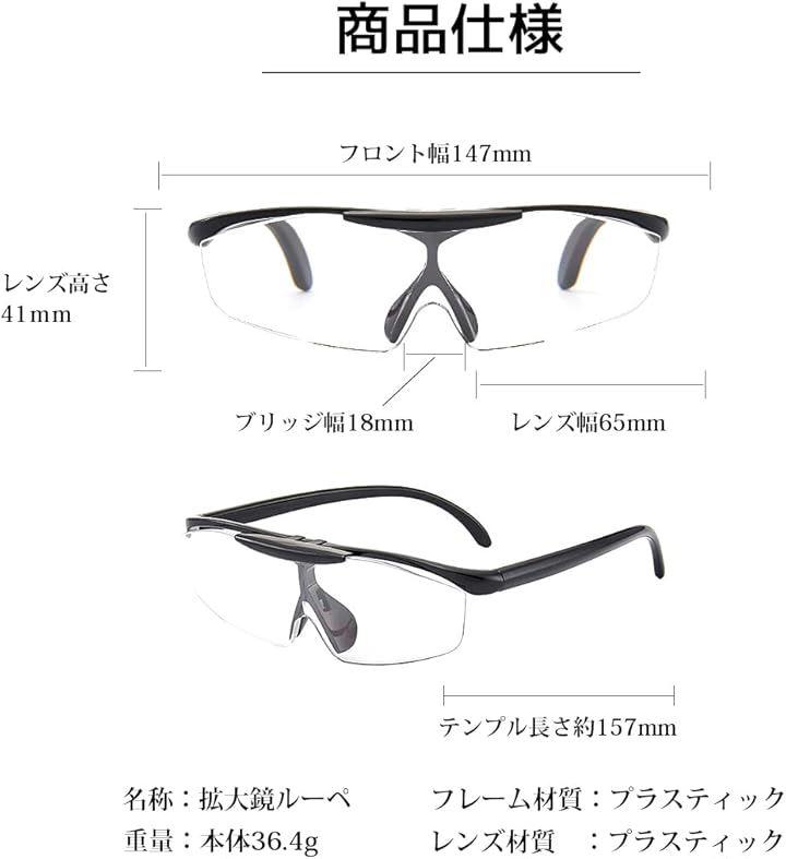 「商品詳細」:フロント幅約147mm、ブリッジ幅約18mm、レンズ約幅65mm、レンズ高さ約41mm、テンプル長さ約157mm「商品内容」拡大鏡ルーペ本体、ケース、クロス 「素材」フレーム材質:プラスチック/レンズ材質:プラスチック