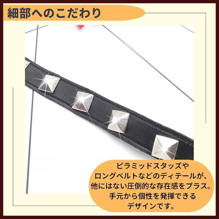 個性的なスタッズとロングベルトが特徴で、手元を一瞬で華やかに演出します。