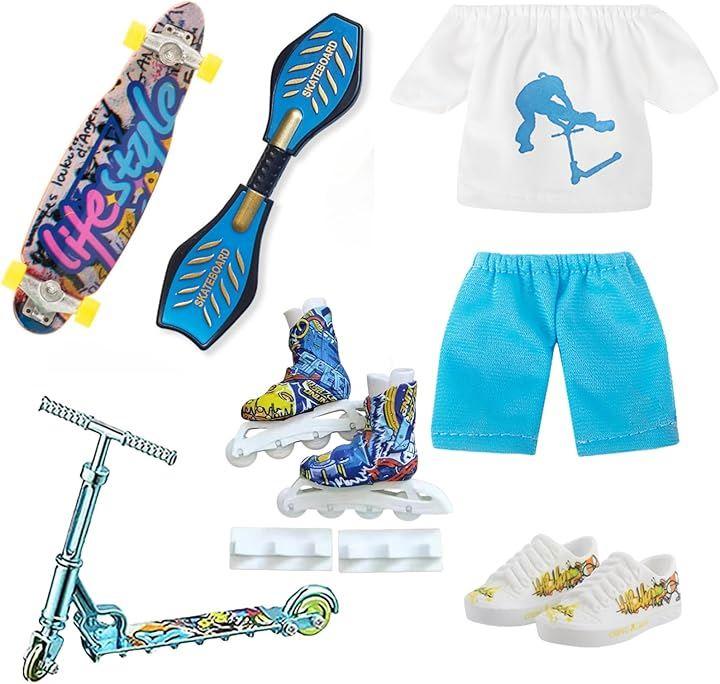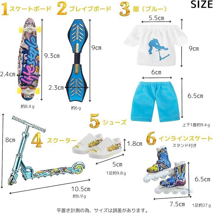 ミニチュアサイズのスケボー本体に加え、指スケ用の服、シューズ、スクーター、インラインスケート、ボードが全て揃っており、届いたその日から多彩なフィンガーボードプレイを楽しめます。