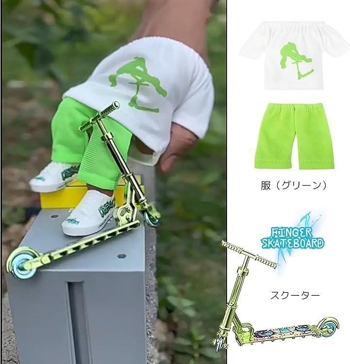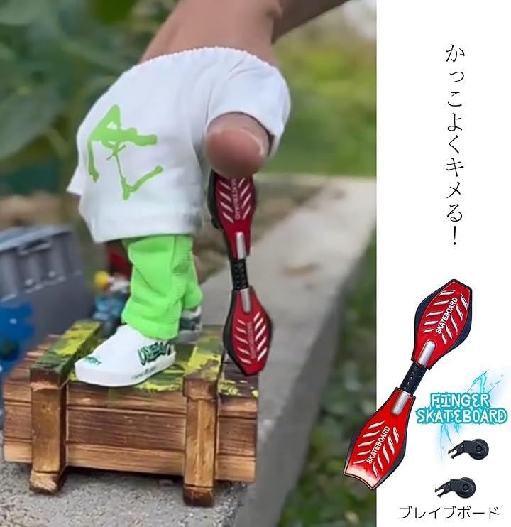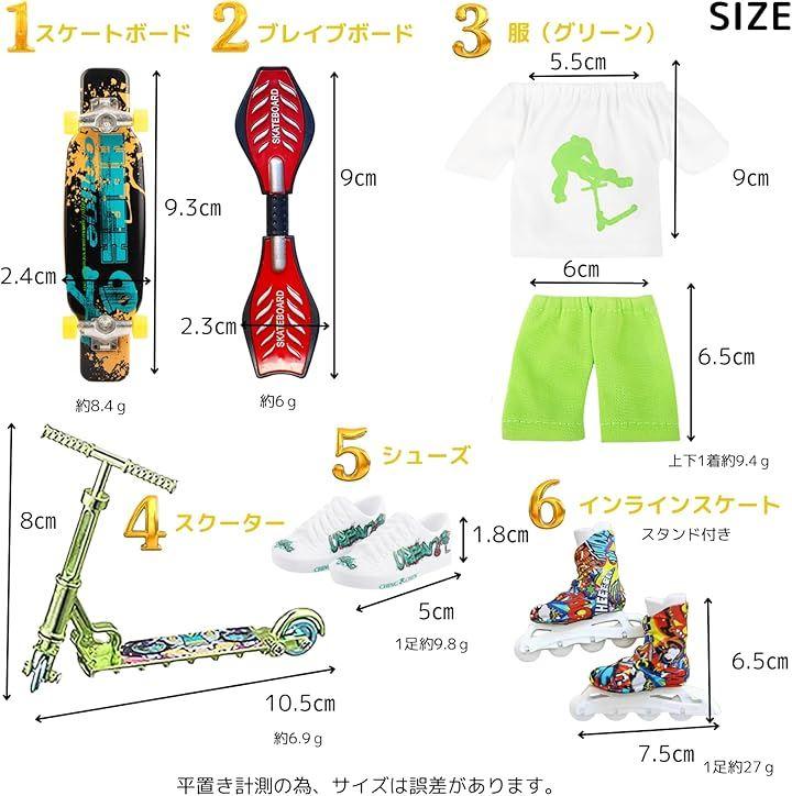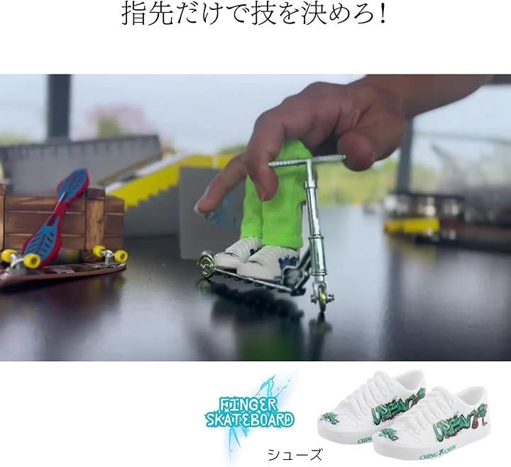 ミニチュアサイズのスケボー本体に加え、指スケ用の服、シューズ、スクーター、インラインスケート、ボードが全て揃っており、届いたその日から多彩なフィンガーボードプレイを楽しめます。
