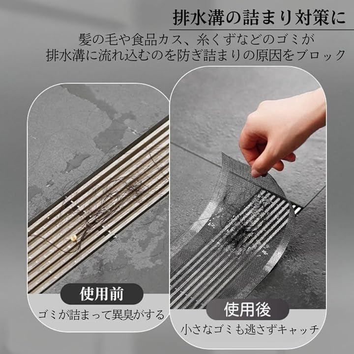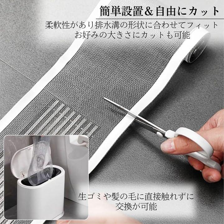「簡単設置&自由にカット」シート両端の粘着テープでしっかり固定でき、柔軟性があるため排水溝の形状に合わせてフィットします。