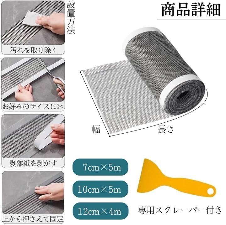 「商品詳細」本体1ロール+専用スクレーパー付き サイズ:7cmx5m / 10cmx5m / 12cmx4m カラー:グレー 材質:ポリエステル