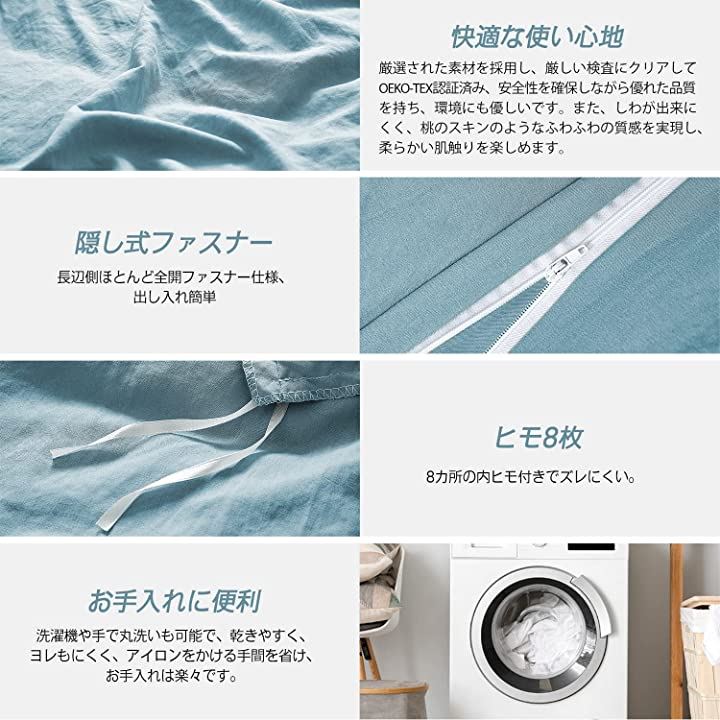 ・「全7色」 白 ┃ グレー ┃ ピンク ┃ むらさき ┃ ブルー ┃ ライトカーキ ┃ セージグリーン・「3サイズ」シングル(150x210cm)┃セミダブル(170x210cm)┃ダブル(190x210cm)・「心を込めた設計」掛ふとんカバー:片側全開仕様とYKKファスナーを採用、スムーズな開閉と出し入れを実現、8カ所の内ヒモ付きでズレになりにくい。