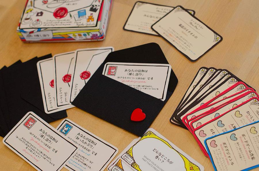対象年齢: 12歳以上 プレイ時間: 約20分 プレイ人数: 2~6人 ジャンル:推し語り(正体隠匿×コミュニケーション) 内容物: たんとうカード6枚/ 黒い封筒6枚/ テーマカード12枚 / 質問カード14枚/ ハートチップ1個 / 説明書(日・英)