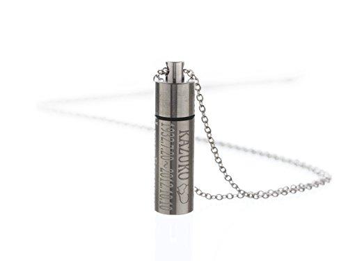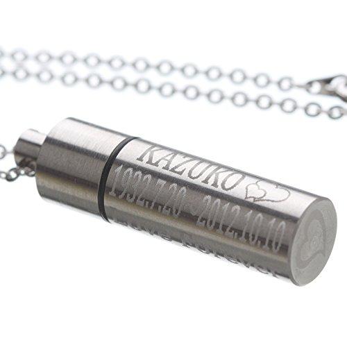 ペンダントサイズ:幅10.5mm×高さ35mm(バチカン含まず) / 重さ:16g / 収納ガラス官:収納口5mm×高さ30mm /チェーンの長さ:60cmペンダント素材:ステンレス / ペンダントチェーン:真鍮(ニッケル加工)刻印内容:1.お名前 2.生誕日~没年月日(例 1942.3.3-2010.2.22) 3.メッセージ(12文字程度まで) 4.底面イラストの有無(イラストは番号でご指示ください)レイアウトから作成いたします。お時間のかかる作業なので、ご配送までに2週間前後かかりますので予めご了承くださいませ。