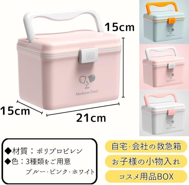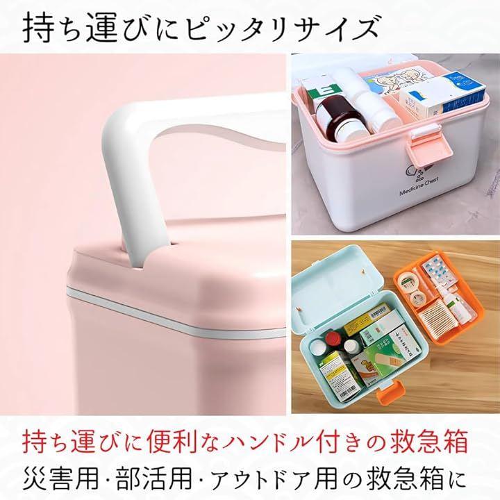 「持ち運びにピッタリサイズ」持ち運びに便利なハンドル付きの救急箱。