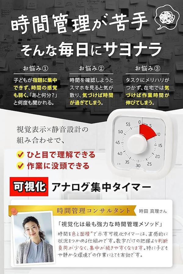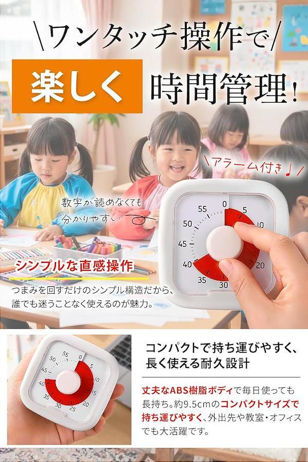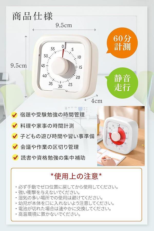 「商品仕様」素材:ABS樹脂|サイズ:約9.5cm x 9.5cm|時間範囲:0~60分|電池:単三電池|カラー:白|可視化盤面・静音設計・手動ダイヤル式