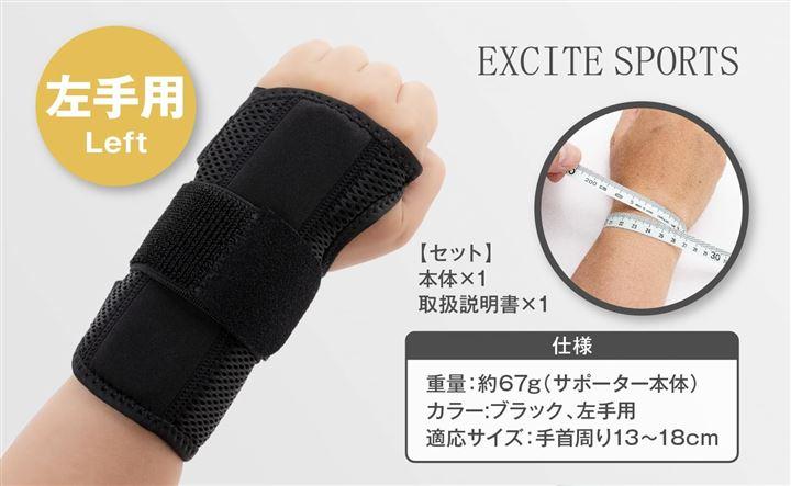 「セット内容」手首サポーター(左手用・1個)、説明書「製品仕様」[適応サイズ] 手首周径13~18cm[素材] 本体:ナイロン、OKクロス/内側クッション:SBR/手の甲プレート:ポリプロピレン/手のひらプレート:アルミニウム合金[重量] 約67g[カラー] ブラック