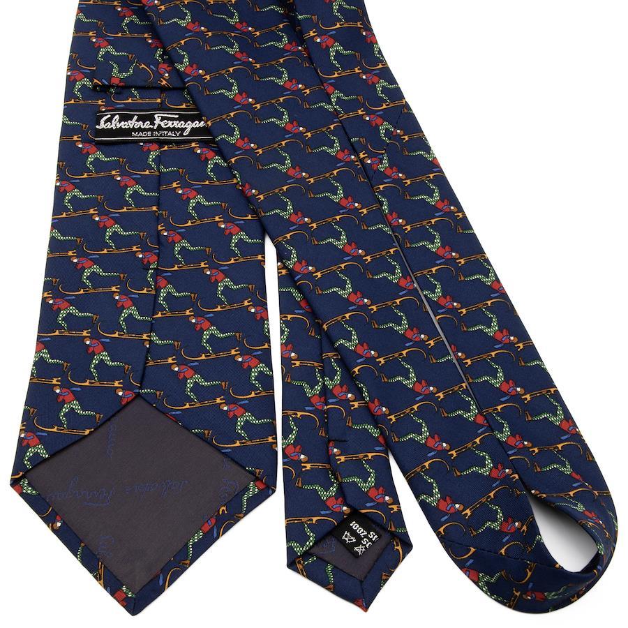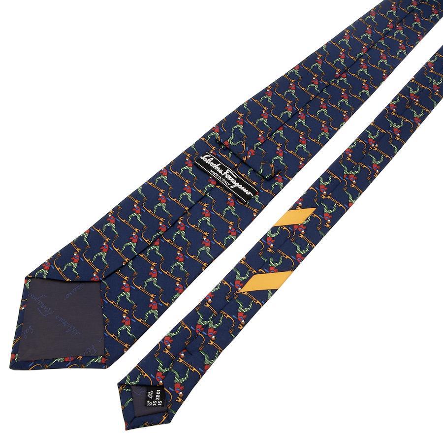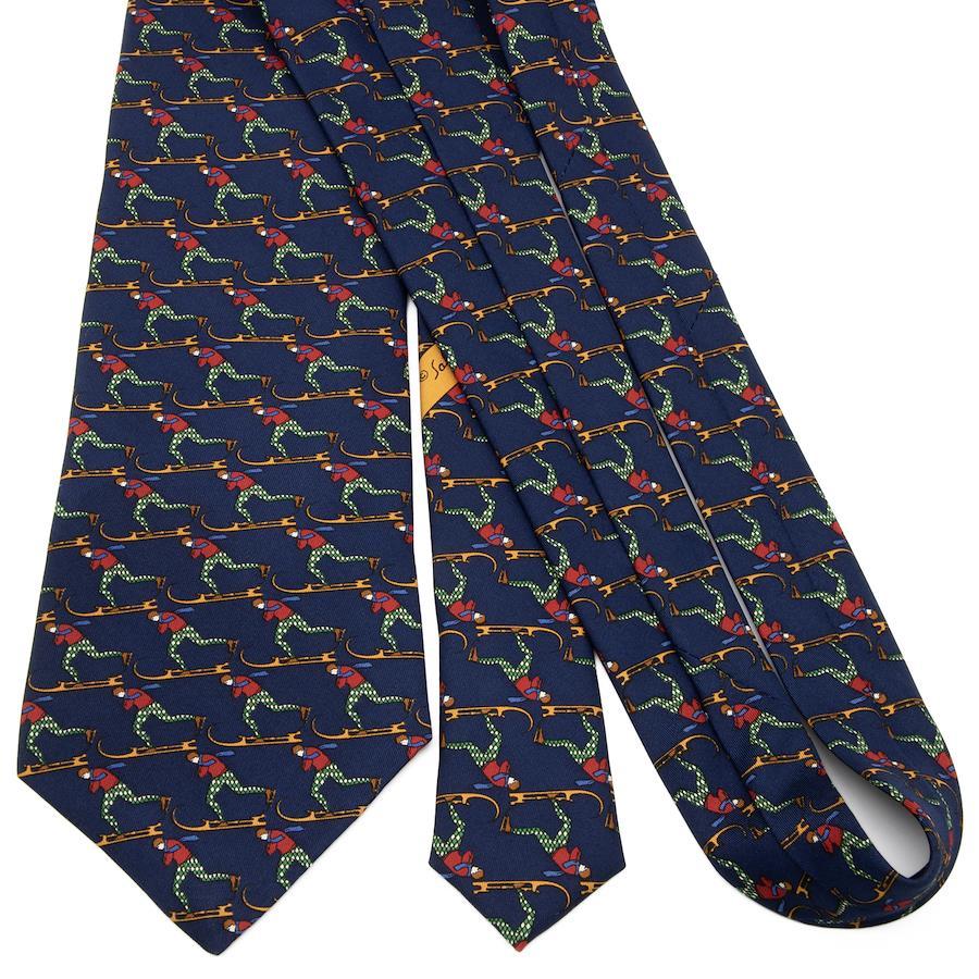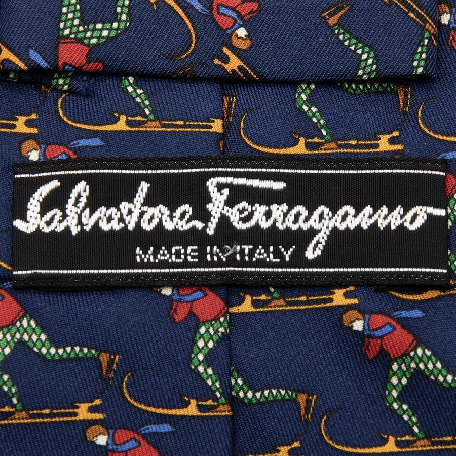 こちらは、スキーを楽しむ姿が胸元で鮮やかに躍動する、フェラガモのネクタイでございます。