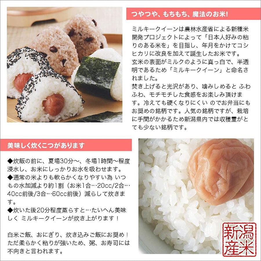 15:00までのご注文で即日発送可能(日・祝を除く) 精米したての新鮮なお米を新潟から産地直送でお届け致します。内容量 : 白米 10kg (5kg×2 袋)年産 : 令和2年産 産地 : 新潟県品種 : ミルキークイーン 使用割合 : 単一原料米販売者 : (株)今議商店 新潟県長岡市山田1-7-4