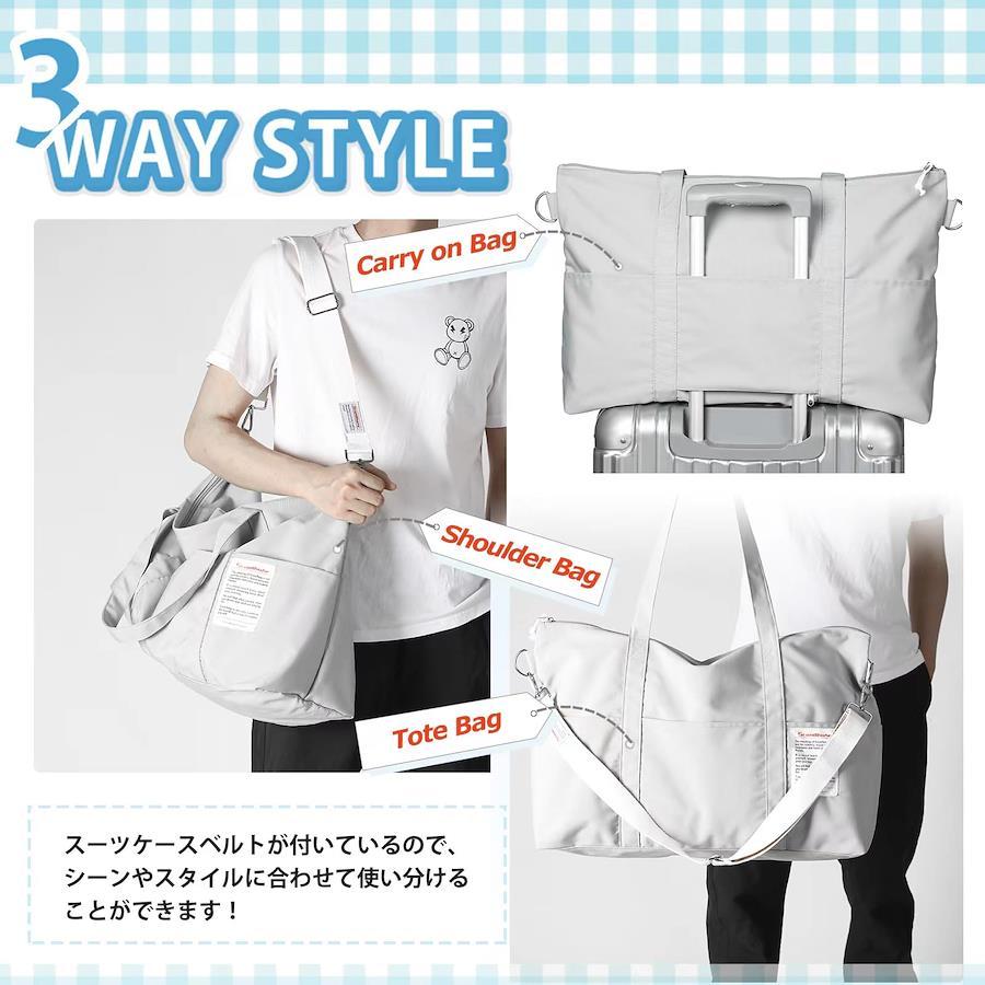 【大容量安心】35Lの大容量海外旅行のサブバッグ、1泊の温泉旅行のメインバッグにも。 回程の特産も豊かに。 【コンパクト】他のバッグと比べて、弊社のバッグは480gのナイロン軽量素材で、使わない時はスーツケースに収納できます。 【3wayの使い方】おしゃれなキャリーバッグはスーツケースの上に置いて移動、バイカラーのショルダーストラップはショルダーバッグとして、トートバッグとしてもお使いいただけます。 ジム、ショッピングなど普段使いはもちろん、男女問わず幅広く使えるライトバッグです。 【撥水加工設計】丈夫な撥水ナイロンを採用しており、中の外からの雨水が濡れた服や他のものを入れても、雨にも全く影響しません! 【便利な多ポケットデザイン】外付けの6つのポケットがあり、コップ、傘、イヤホンなどの小さい物を置くことができ、取り出しやすい。 パスポートなどのパスケースも内蔵。