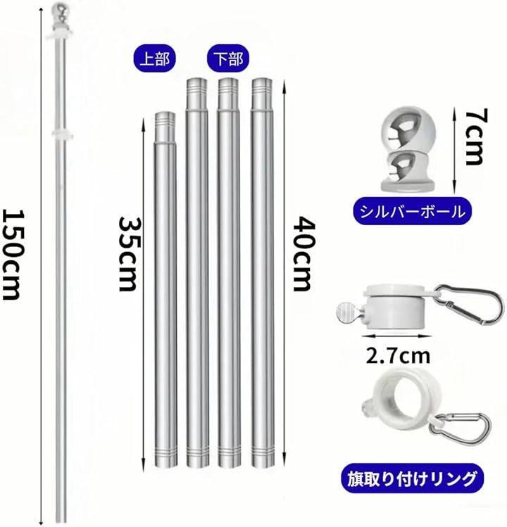 素材・構造:国旗は耐候性と発色性に優れたポリエステル製、ポールは錆びにくいステンレス製で屋外使用にも適し、ホルダーは頑丈な金属製です。