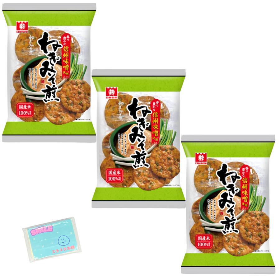 日新製菓 ねぎみそ煎 6枚 ×3袋セットです。 うす堅焼きのパリッとした食感にこだわりの味付け。 それぞれの素材の味を生かし大切に焼き上げました。 はじめに濃口醤油、そのあとに信州みそベースのみそだれを重ね漬けすることで味に奥ゆきを加えました。