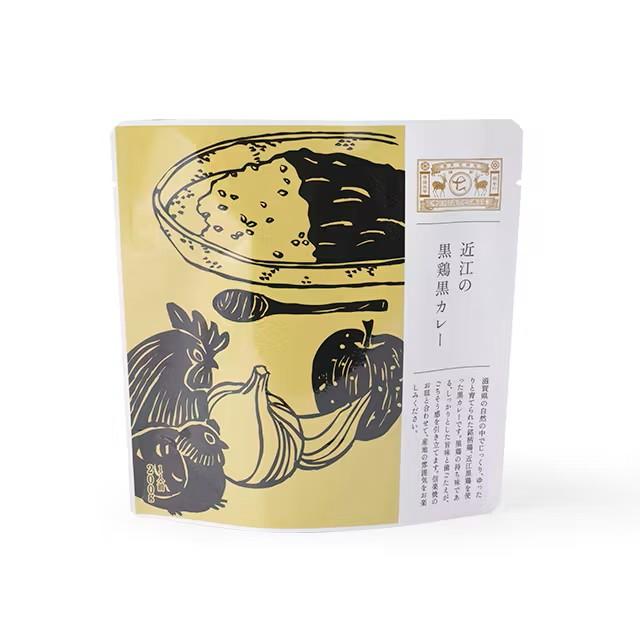 滋賀の自然の中でじっくり、ゆったりと育てられた銘柄鶏「近江黒鶏」を使い、黒鶏の持ち味である、しっかりとした旨味と肉の歯ごたえが感じられる黒いカレーです。