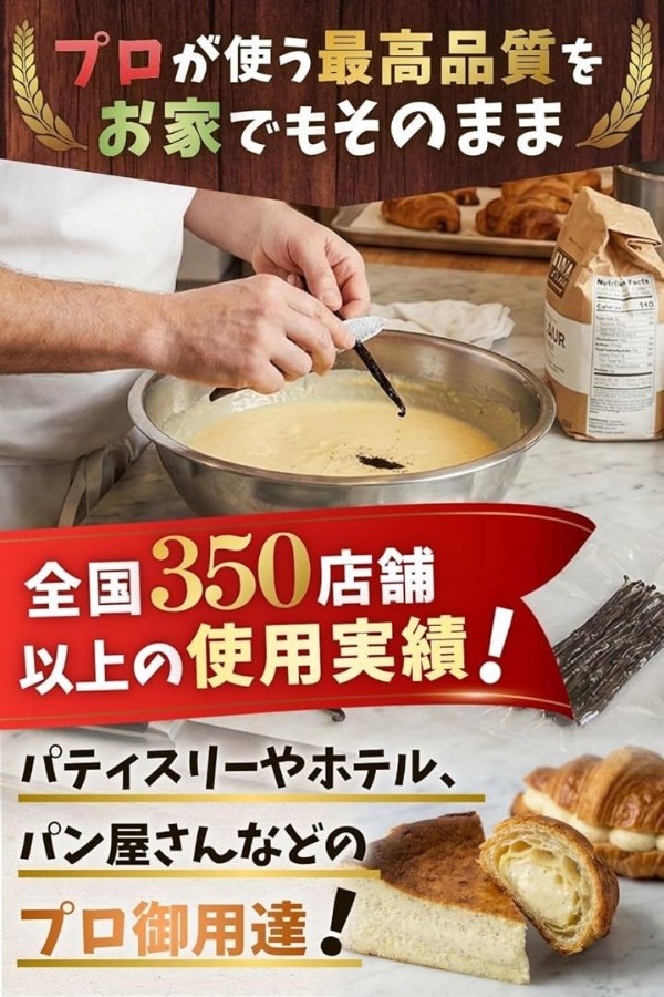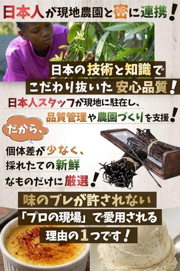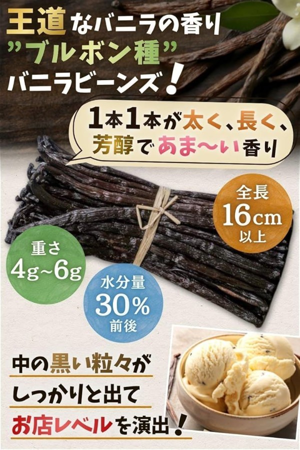 1本1本が太く、中までしっかり詰まっているため、スイーツにすると黒い粒々が美しく現れ、バニラ感満載の仕上がりを楽しめます。