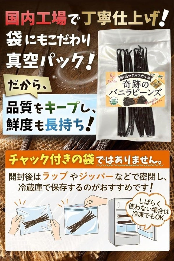 「賞味期限は製造日から1年」ごゆっくりお使いいただけるよう、賞味期限が残り6ヶ月以上の期間があるバニラビーンズをお届けします。
