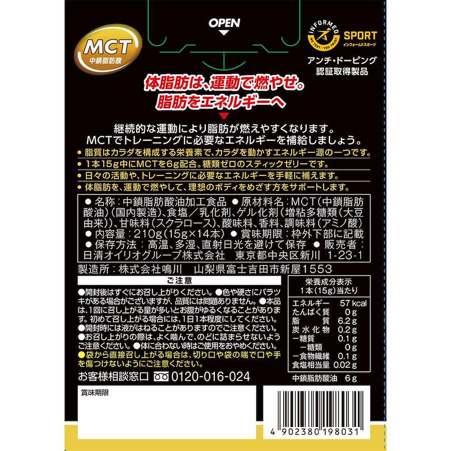 ■サイズ:??13.3x9.2x8cm;500g 1本当たりMCT(中鎖脂肪酸油)を6g含んだ、糖類ゼロでヨーグルト味の、食べやすいソフトタイプのスティックゼリーです。 14本入りを2個と商品説明リーフレット付き。 【内容量】210g(15g×14本)×2 【原材料】MCT(中鎖脂肪酸油)(国内製造)、食塩/乳化剤、ゲル化剤(増粘多糖類(大豆由来))、甘味料(スクラロース)、酸味料、香料、調味料(アミノ酸) 【成分情報 1食(15g)当たり】熱量:57kcal、たんぱく質:0g、脂質:6.2g、炭水化物:0.2g、食塩相当量:0.02g、中鎖脂肪酸油:6g