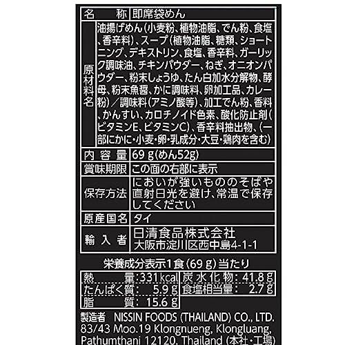 油揚げめん(小麦粉、植物油脂、でん粉、食塩、香辛料)、スープ(植物油脂、糖類、ショートニング、デキストリン、食塩、香辛料、ガーリック調味油、チキンパウダー、ねぎ、オニオンパウダー、粉末しょうゆ、たん白加水分解物、酵母、粉末魚醤、かに調味料、卵加工品、カレー粉)/調味料(アミノ酸等)、加工でん粉、香料、かんすい、カロチノイド色素、酸化防止剤(ビタミンE、ビタミンC)、香辛料抽出物、(一部にかに・小麦・卵・乳成分・大豆・鶏肉を含む)