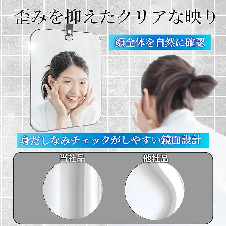 「曇りを抑えて視界をキープ」 防曇コーティングを施した設計により、入浴中や洗面時でも鏡が白くなりにくく、視界が遮られにくいのが特長です。