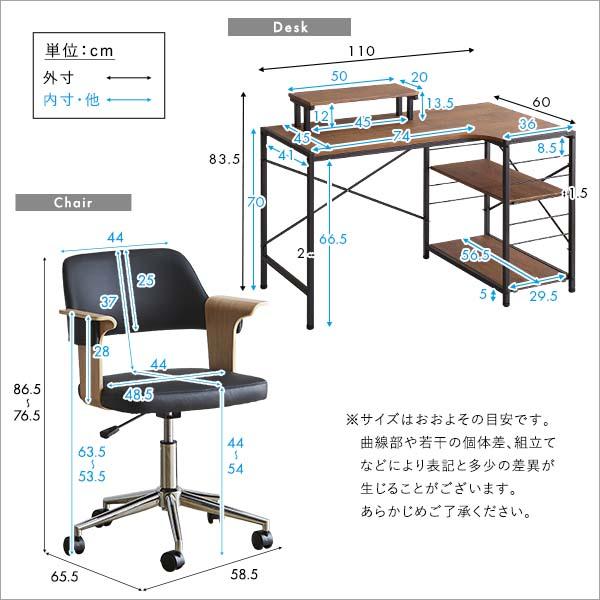 【素材】(チェア)フレーム:突板化粧曲合板(ラッカー塗装)張地:合成皮革(PU)内部:積層合板、ウレタンフォーム脚部:スチール(クロームメッキ)、ナイロンキャスター(テーブル)MDF、スチール【商品サイズ】チェア:W58.5×D65.5×H76.5-86.5 (SH44-54)cmテーブル:W110cm×D60cm×H83.5cm【商品重量】チェア:8kgテーブル:10kg【梱包サイズ】チェア:W55×D61×H44cmテーブル:112x71.5x6.5cm【梱包重量】チェア:10?テーブル:17?【生産国】中国【カラー】SH-BR,SH-NA,WA-BR,WA-NA【その他】組み立て時間45分>>曲線が美しいデスクチェア(単品)はこちら >>ヴィンテージ風L字パソコンデスク(単品)はこちら
