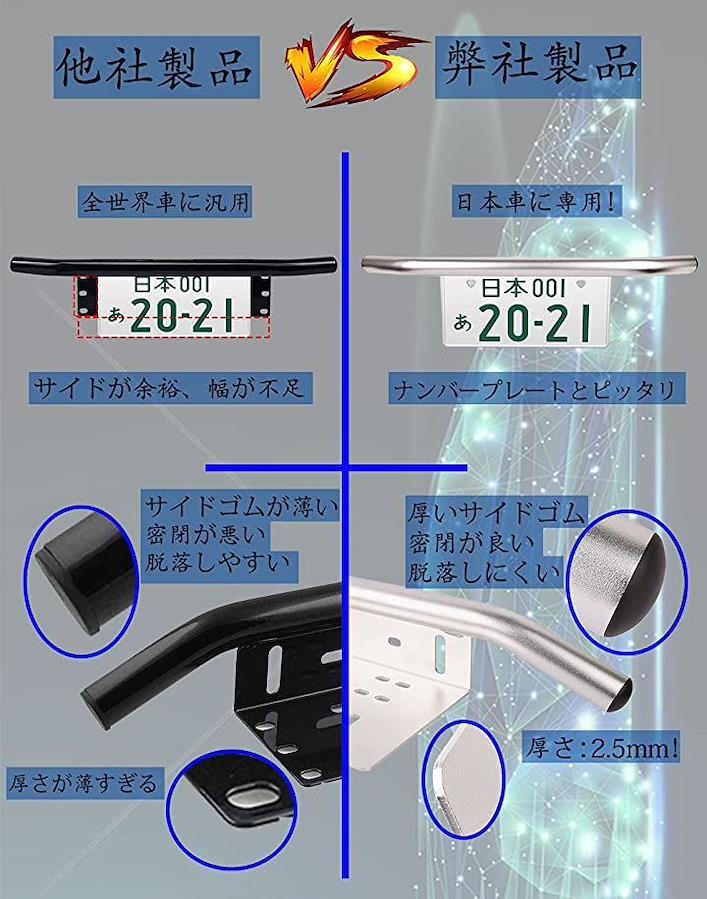 サイドの余裕と幅不足問題なし,揺れ止めアップ。最新アルミニウム合金で作られて厚さ2.5mmまで増やしてもっと頑丈になり、でも重量は0.65kgまで軽くなります。改新。日本車ナンバー仕様と同じサイズに改新しました。