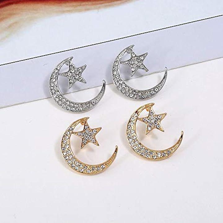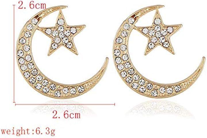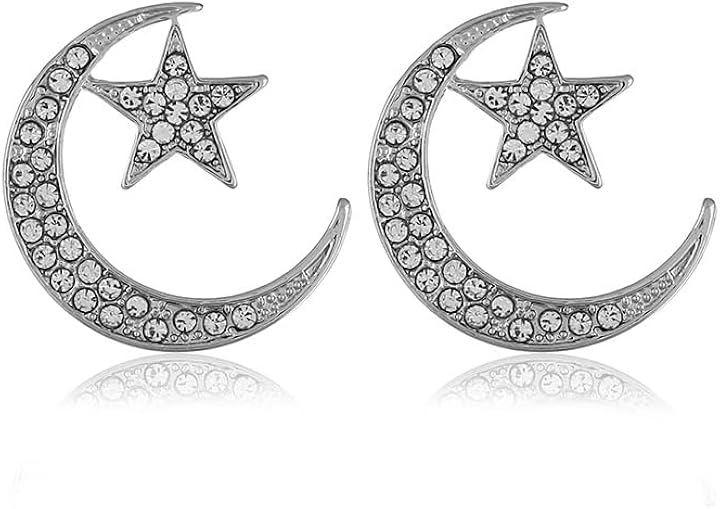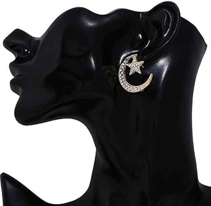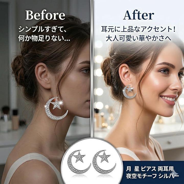 きらめくストーンと月星モチーフのデザインが、女性らしい柔らかな印象を演出し、カジュアルからフォーマルまで幅広いスタイルに取り入れやすいピアスです。
