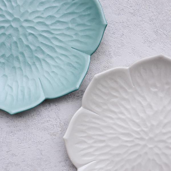 ────────────────────────少しパールがかかったような色味で絶妙な大人かわいいカラーのアイテムです。艶感を消したようなおしゃれな雰囲気。銘々皿はケーキ皿にピッタリなサイズ。豆皿はカトラリーレストや薬味入れにピッタリ。お花の形の全体にうっすらと彫があります。 ──────────────────────── 商品詳細 サイズ 約直径16×高さ1.8cm 容量 (満水時)約cc 材質・質感 磁器・少しザラザラ 備考 ・電子レンジ ×・食洗機 〇●こちらは銘々皿1枚の価格です。※写真のカトラリーなどはつきません。※商品の特性上、わずかな色のムラが出る場合があります。※商品以外のものは撮影備品のため、含まれません。