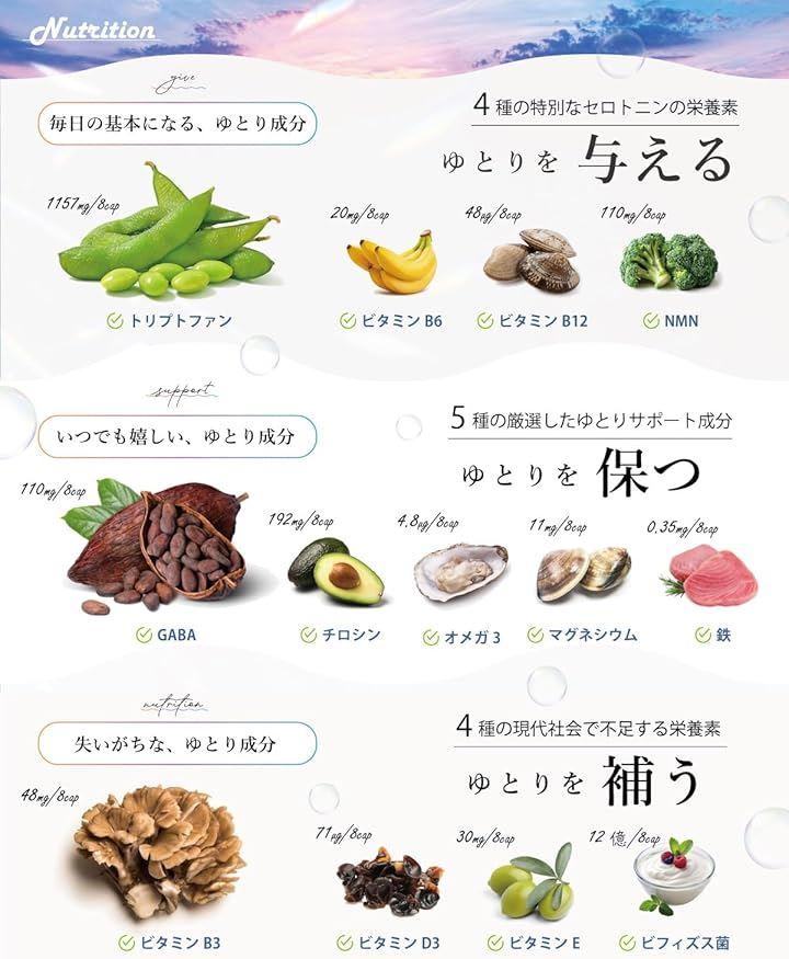 原材料:NMN(国内製造)、GABA(y・アミノ酪酸)、DHA・EPA含有精製魚油、 マルトデキストリン、ナタネ硬化油脂、食用精製加工油脂、ビフィズス菌末(デキ トリン、ビフィズス菌体) / L-トリプトファン、HPMC、L・チロシン、香料、ドス ミンD、ニコチン酸、ビタミンB12、ジェランガム、ヘム鉄、ビタミンB6、配 グネシウム、トレハロース、カゼインNa(乳由来)、グリセリン脂肪酸エステ 化防止剤(V.E、V.C、ローズマリー抽出物)、プルラン