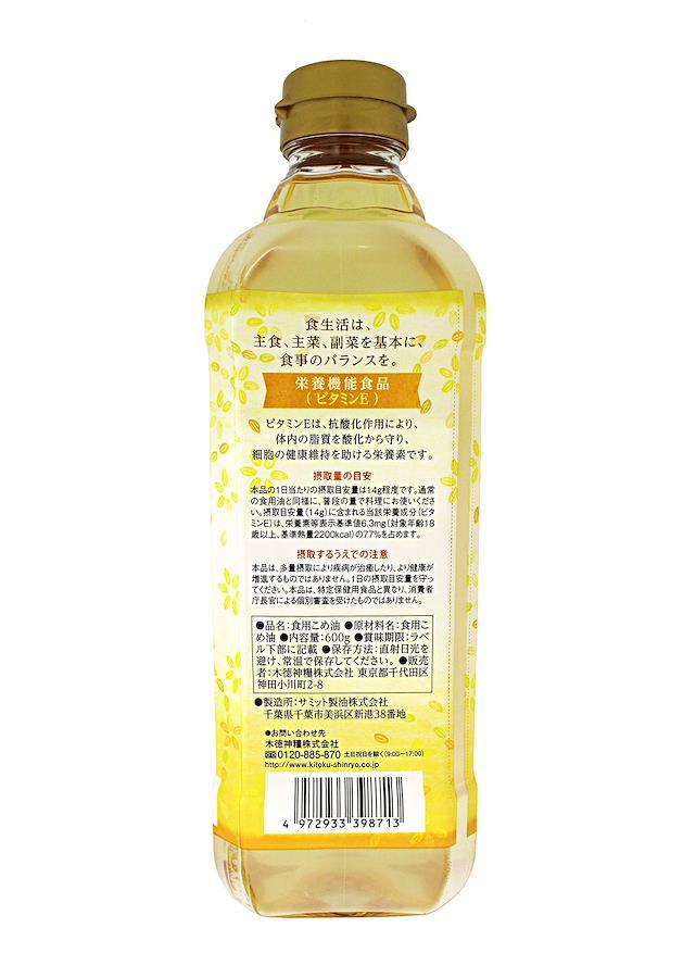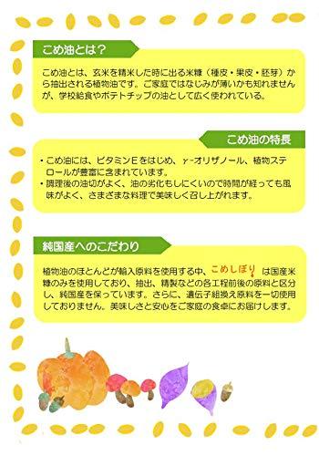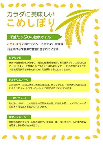 「遺伝子組み換え農作物」を原料としない、国産米ヌカから生まれた「こめ油」です。摂取量の目安 1日当たり10~14gを目安に調理用油として、普段ご使用の食用油と同様にご使用ください。こめ油は、1ビタミンE(トコフェノール)が豊富に含まれ、2加熱による酸化が起きにくい、3油よい(揚げ物をしていて気分を悪くする)が起きにくい、4油きれが良い5オレイン酸が多いという特徴があります。