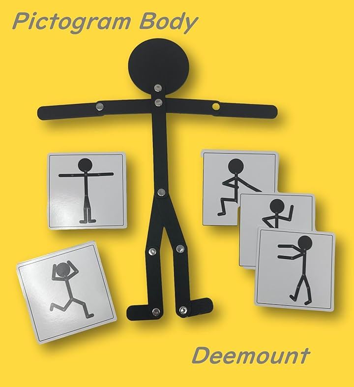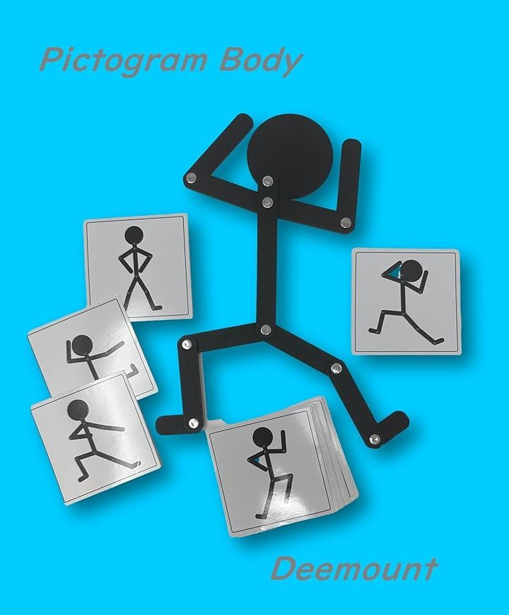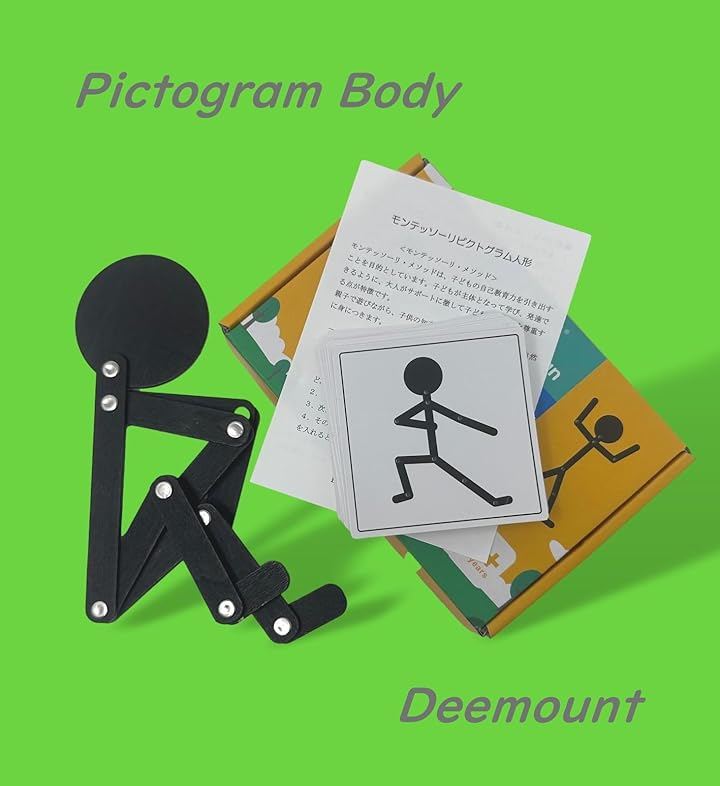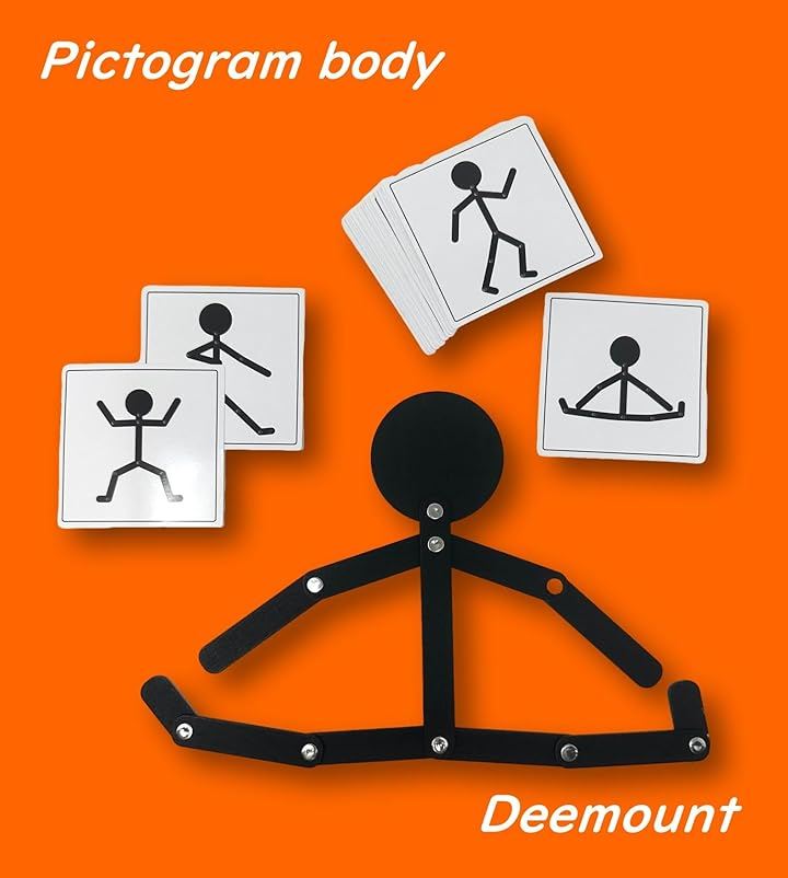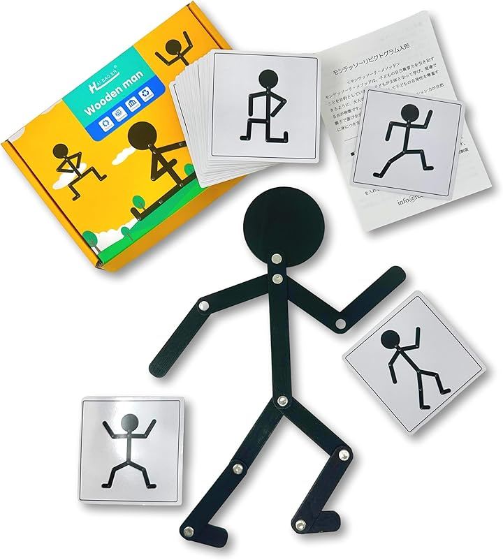 セット内容と付属品:木製の可動式人体人形、様々なポーズを示すピクトグラム問題カード、遊び方解説書が付属しており、届いたその日からすぐに遊び始めることができます。