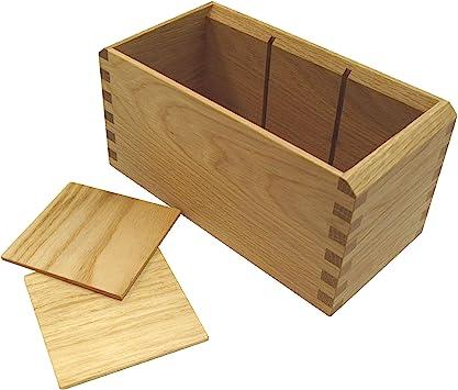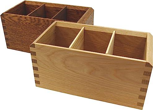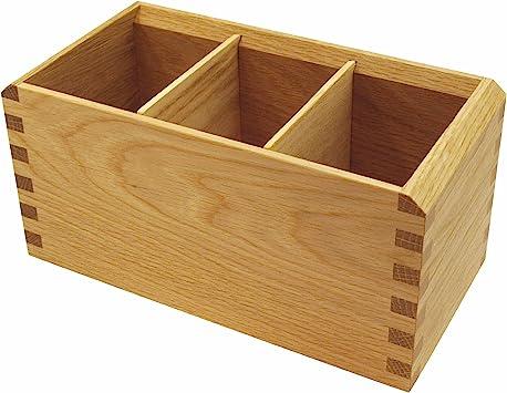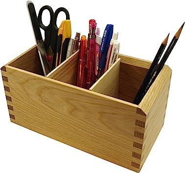 外側サイズ:横幅220×奥行き110×深さ108(mm)。内側サイズ(1マス):横幅64×奥行き85×深さ95(mm)。内側サイズ(全体):横幅195×奥行き85×深さ95(mm)。。ナラの無垢材を使用したペンスタンドです。接合部にはクギやネジを使わない「あられ組み」が施されているので、とても丈夫です。。また、底にはコルクが貼られていて、入れる物を傷めないように配慮されており、実用性も重視しています。。中の仕切りは取り外しができるようになっているので、ハサミや定規など幅の広い文具も収納可能です。。。