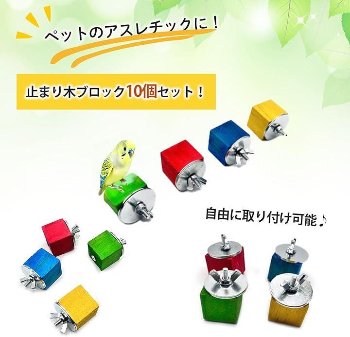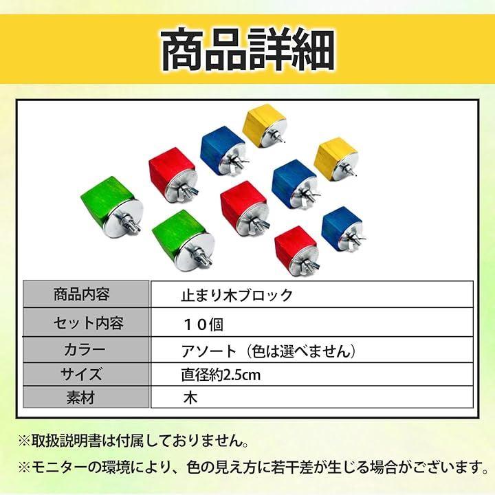 「商品内容」止まり木ブロック「セット内容」10個「カラー」アソート(色は選べません) 「サイズ」直径約2.5cm「素材」木 *モニターの環境により、色の見え方に若干差が生じる場合がございます。