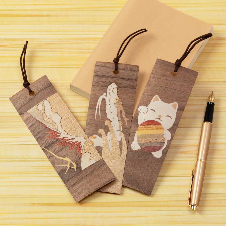 塗装ではなく、色味の違う天然木の組み合わせによって絵柄を表現した、木象嵌(もくぞうがん)のしおりです。