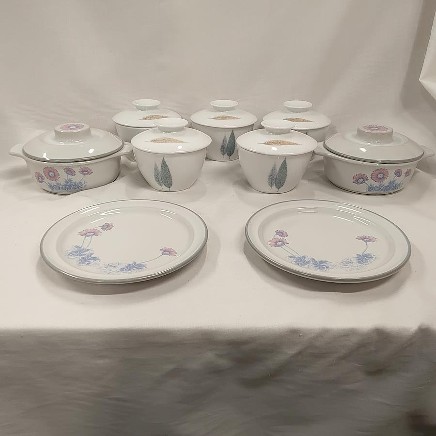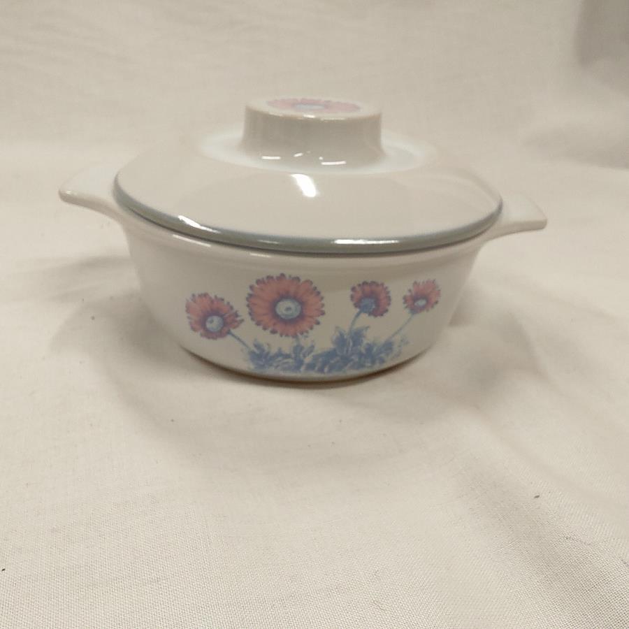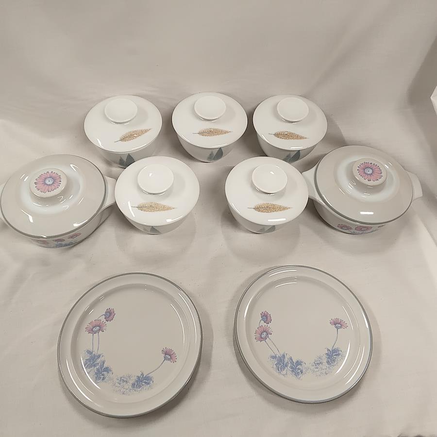 未使用 ノリタケ製 ココット 5点 鉢 2点 皿 2点セット 日本製 です。椀には並木と葉っぱが描かれ、ココットと皿にはディジーのはなが描かれています。軽くチェックした所、椀のフタに小キズを1ヶ所発見しました。未使用ですが長期保管によりスレや傷等、経年劣化しています。