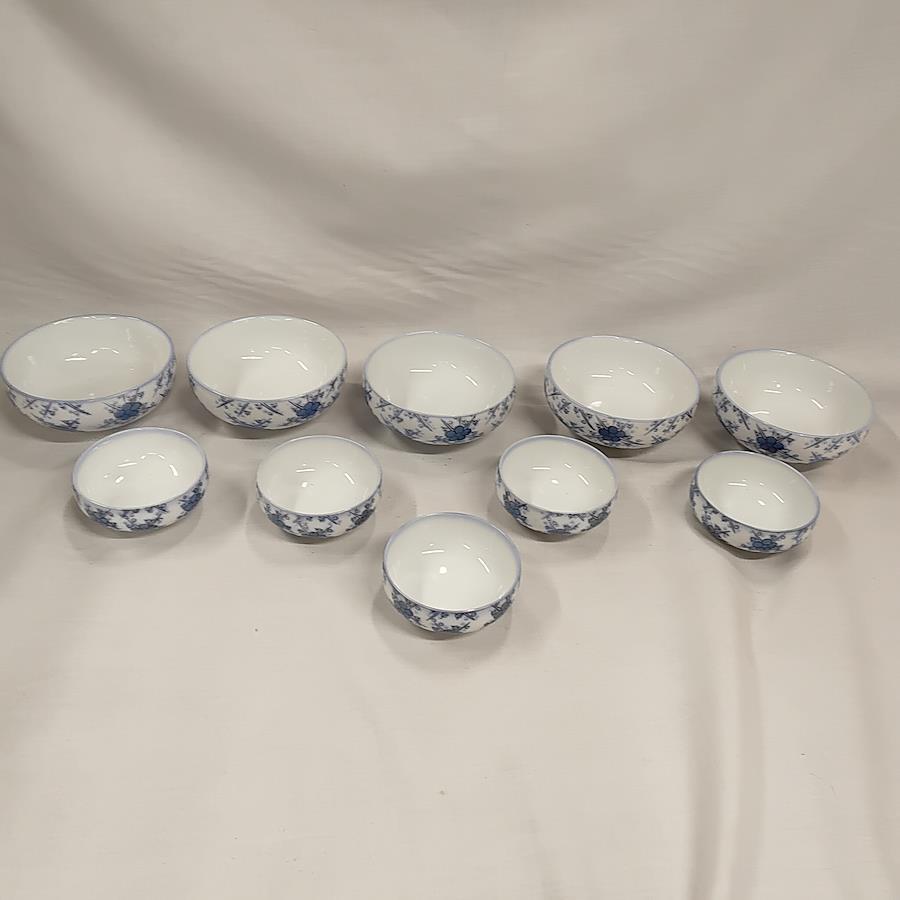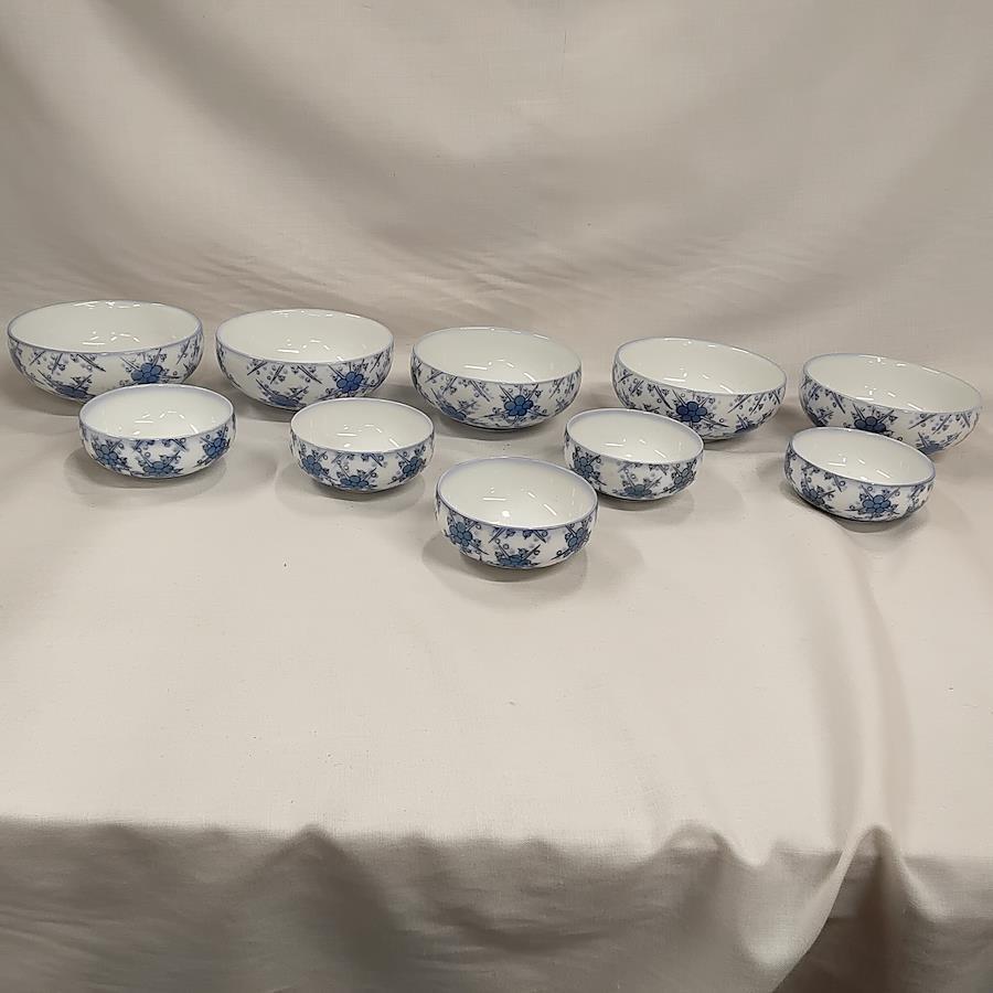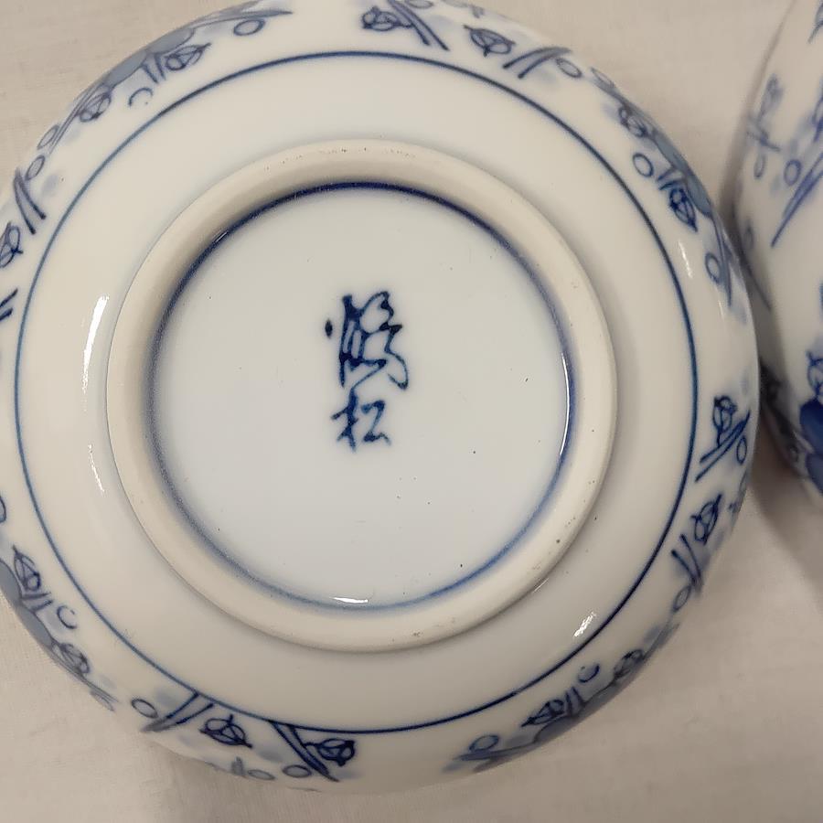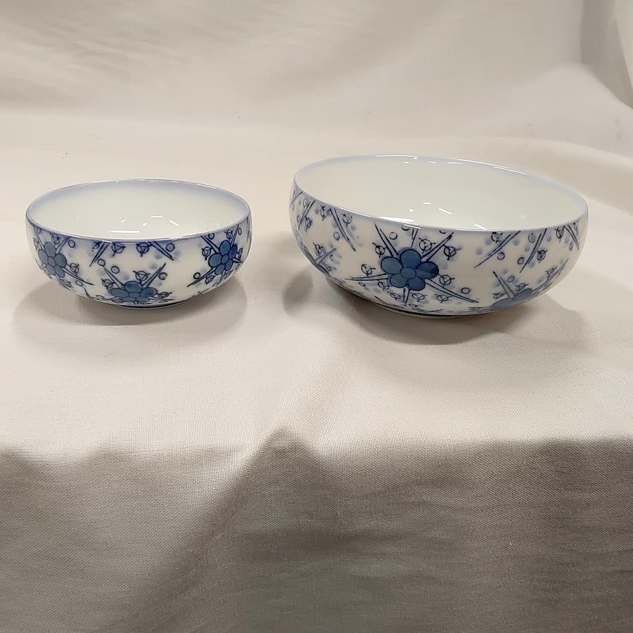 未使用 有田焼 小鉢 しょうゆ皿 5組セット 昭和レトロです。青い梅の花柄模様の美しい小鉢としょうゆ皿です。裏側には鶴松の銘があります。箱には高級有田焼頒布会 鶴松 倉梅 第13回とあります。未使用ですが長期保管により経年劣化しているかもしれません。軽くチェックしましたが中の品には傷もなく、外箱のみ、シミ、汚れ等 経年劣化があると思います。