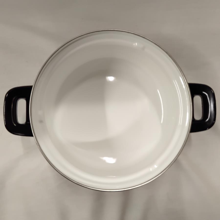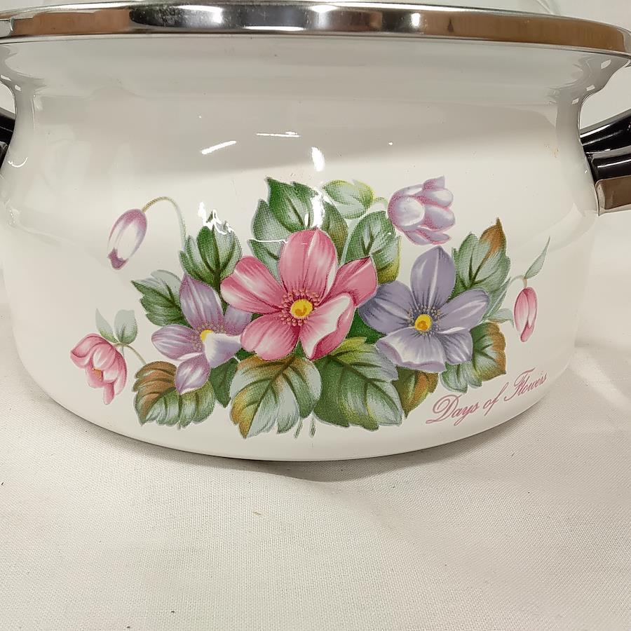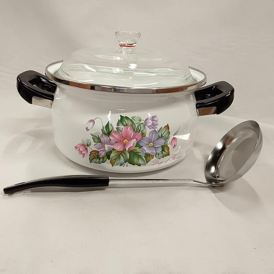 未使用 象印 ホーロー 両手鍋 お玉 セット です。花柄 昭和レトロな両手鍋ですガラスブタ付きで中身が見やすい。直径20cm 容量3.5lの程よいサイズです。長期保管により経年劣化があるかもしれません。軽くチェックしましたが美品だと思います。お玉の底に細かなキズがあります(写真参照)