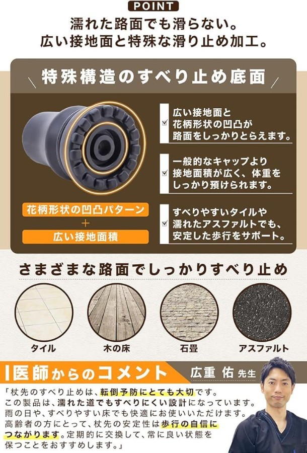 「医師が監修した、信頼できる歩行サポート設計」この杖先ゴムは、医学博士・日本抗加齢医学会専門医である広重佑先生の監修のもと設計された製品です。