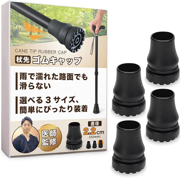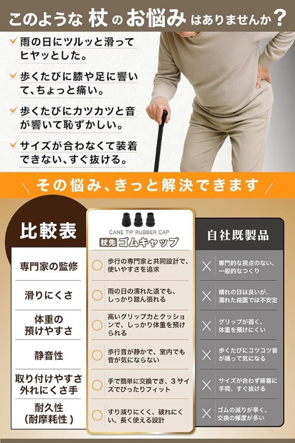一般的なゴム製キャップとは異なり、濡れたアスファルトやタイルでもしっかり接地し、すべりによる転倒リスクを軽減します。