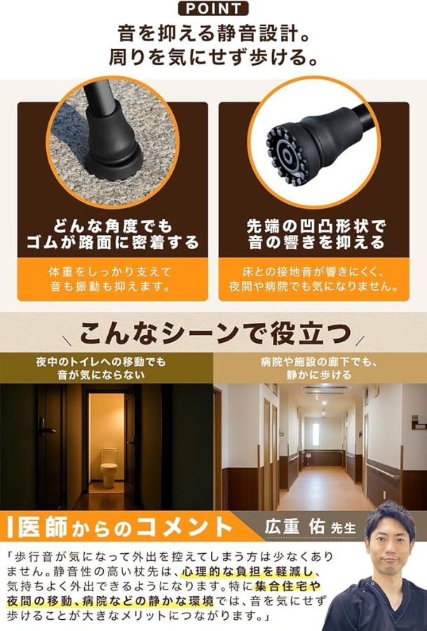 「静かな場所でも気にならない、音が響きにくい構造」集合住宅や病院、静かな住宅街などで杖の「コツコツ音」が気になる方にもおすすめです。