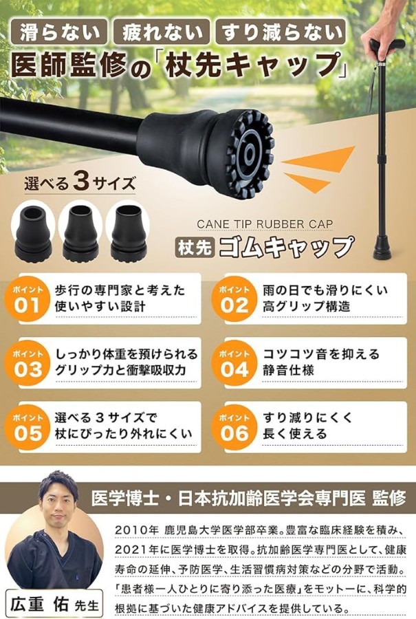 「医師が監修した、信頼できる歩行サポート設計」この杖先ゴムは、医学博士・日本抗加齢医学会専門医である広重佑先生の監修のもと設計された製品です。