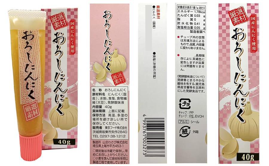 【商品詳細】 ■名称:おろしにんにく ■原材料名:にんにく(国産)、水飴、食塩、食物繊維(大豆)、発酵酸味液 ■内容量:40g ■賞味期間:9ヵ月 ■保存方法:高温、多湿の場所を避け涼しい所で保存してください。 ■販売者:東京フード株式会社 ■製造者:山忠わさび株式会社 ※開封後は冷蔵で保存し、早めにお召し上がりください。 ※小麦を含んだ原材料を同じ製造工程で使用しています。 ※チューブ内の空間は充填方法によるもので、品質、内容量に変わりありません。 ※長期保存により、茶褐色に変色しますが品質には問題有りません。 【発酵酸味液について】 醗酵香とまろやかな酸味を有する、鹿児島県産甘薯等を主原料にした発酵食品です。 【栄養成分表示】1食1gあたり ・エネルギー:1.78kcal ・たんぱく質:0.03g ・脂質:0g ・炭水化物:0.41g ・食塩相当量:0.05g *製造者調べ